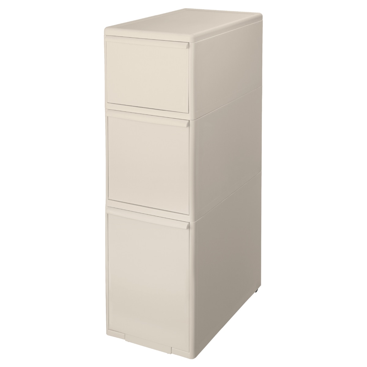 ちょっとしたすき間で使える引き出しタイプのスリムなストッカーです。幅25.5cmとスリムながら奥行きが46.5cmあるので収納力は抜群です。透け感がないストッカーは、生活感の出る調味料や洗剤のストックなどを入れても気になりません。