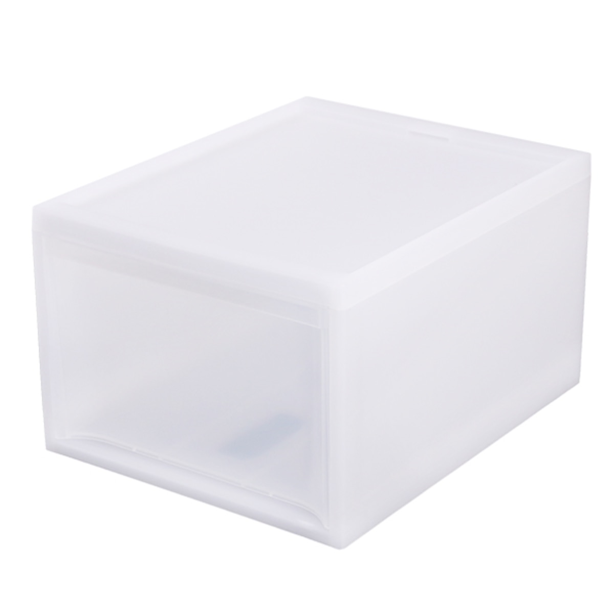 引出しはクリアに近い半透明で、開けなくても中身が分かりやすくなっています。外枠部分は白味の強いやわらかな半透明なので、中身が透けすぎずお部屋の雰囲気を壊しません。