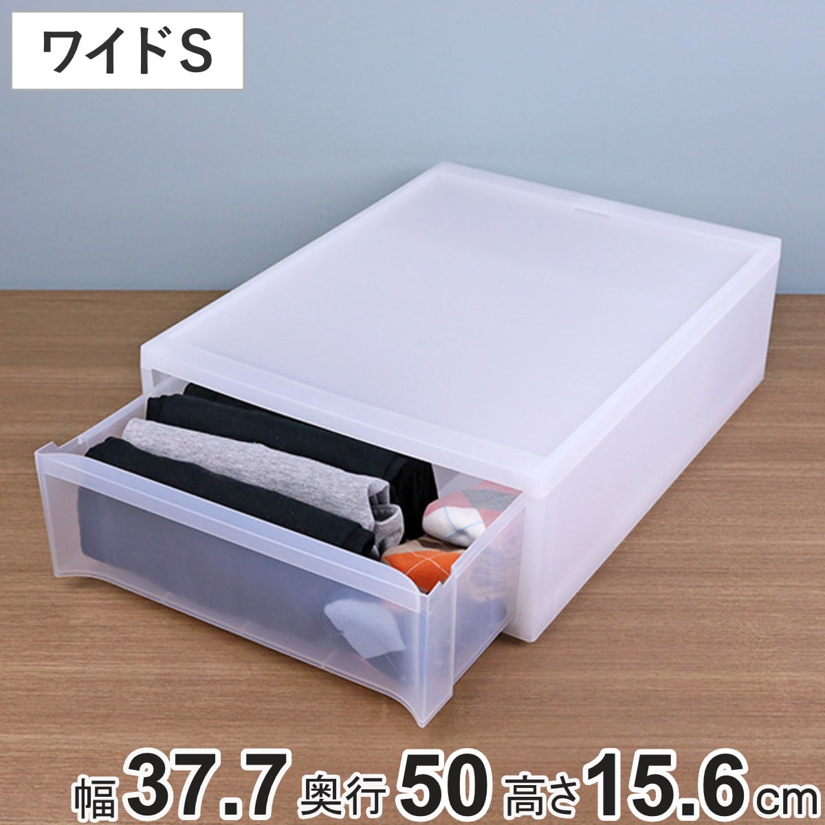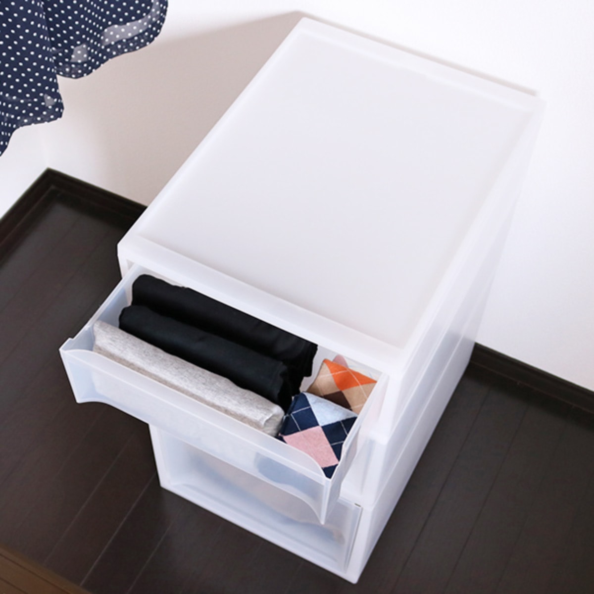 引出しはクリアに近い半透明で、開けなくても中身が分かりやすくなっています。外枠部分は白味の強いやわらかな半透明なので、中身が透けすぎずお部屋の雰囲気を壊しません。
