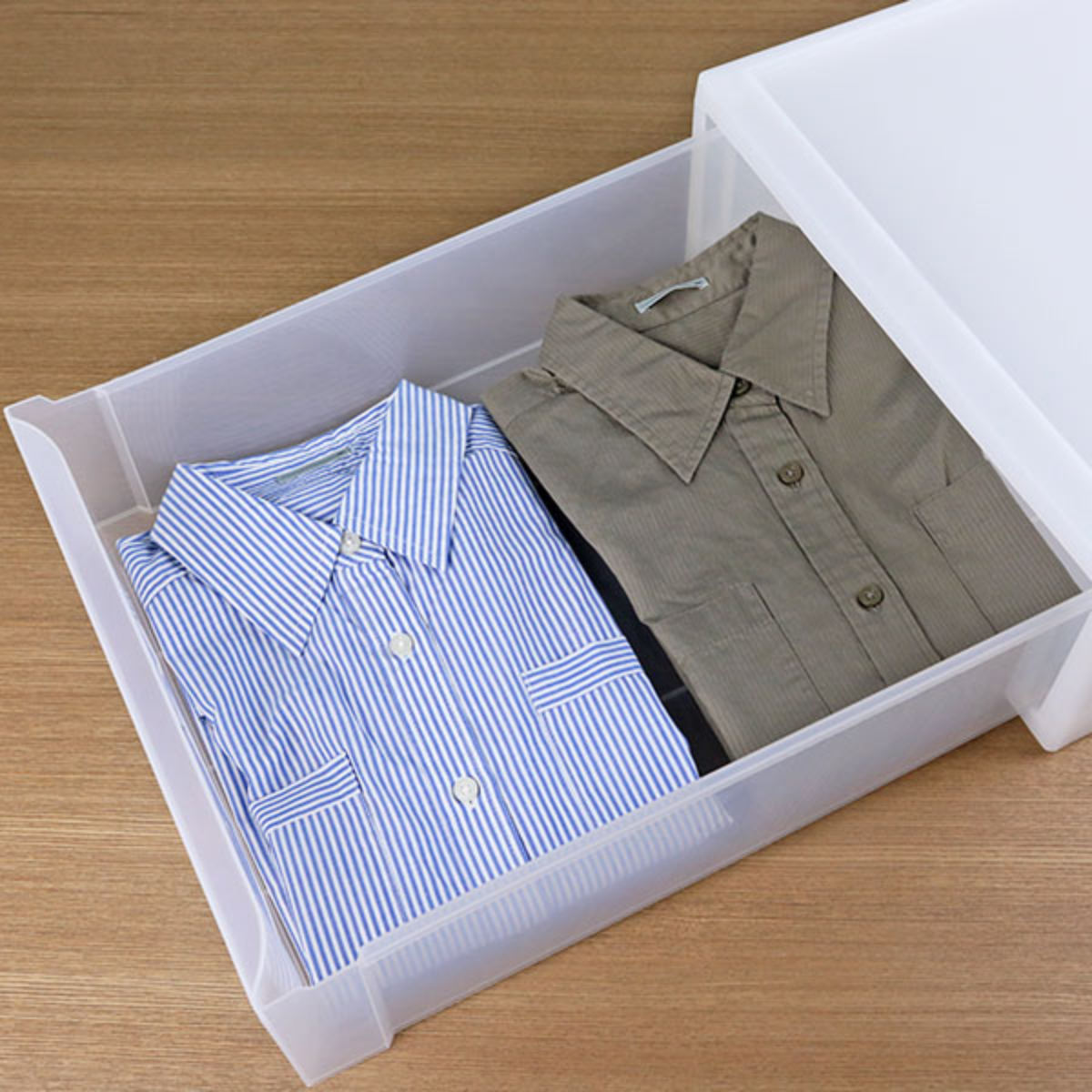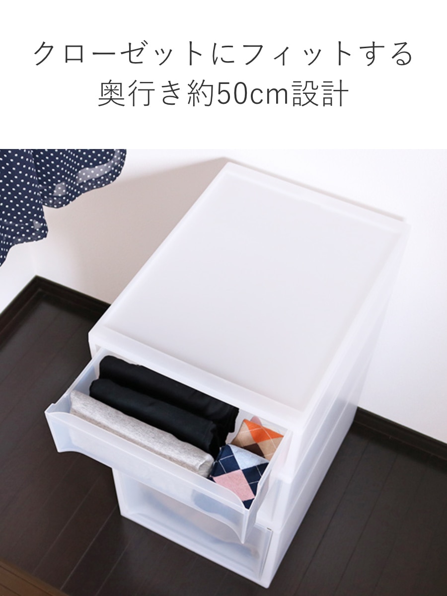 クローゼットにフィットする奥行き約50cm設計。衣類小物の整理にも最適な浅め一段タイプで、引き出しには一般的にたたんだシャツが横向き2枚入るサイズになっています。無駄のないシンプルなデザインで、どんな空間にも馴染みやすく、使いやすい収納アイテムです。