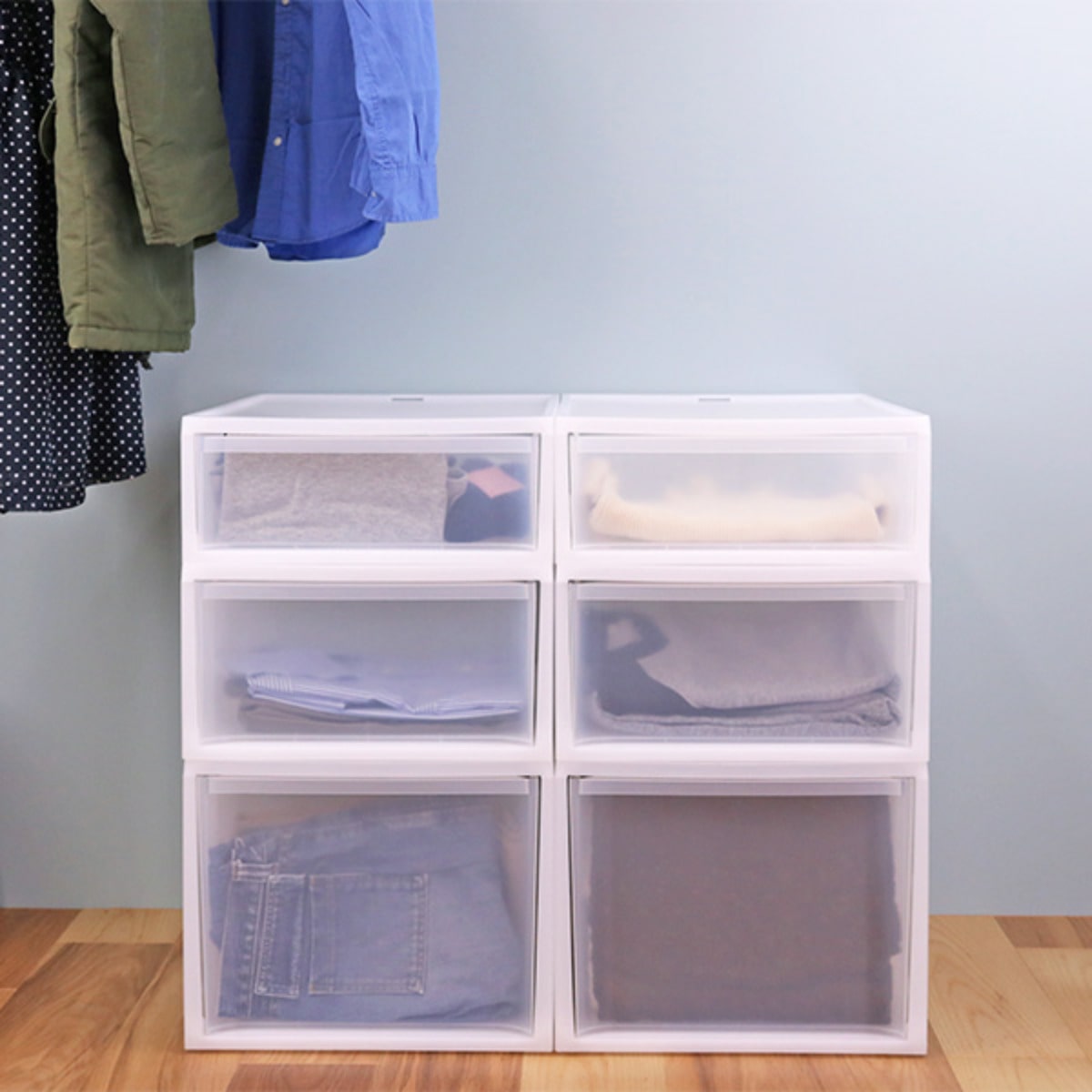 引出しはクリアに近い半透明で、開けなくても中身が分かりやすくなっています。外枠部分は白味の強いやわらかな半透明なので、中身が透けすぎずお部屋の雰囲気を壊しません。