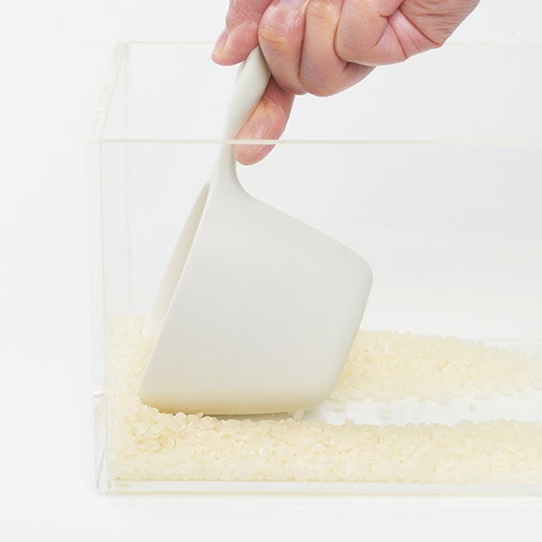 フチが薄くてまっすぐだから、米びつ底のお米がすくいやすいです。また、柄とカップのつながりがスムーズなのですり切りしやすいです。