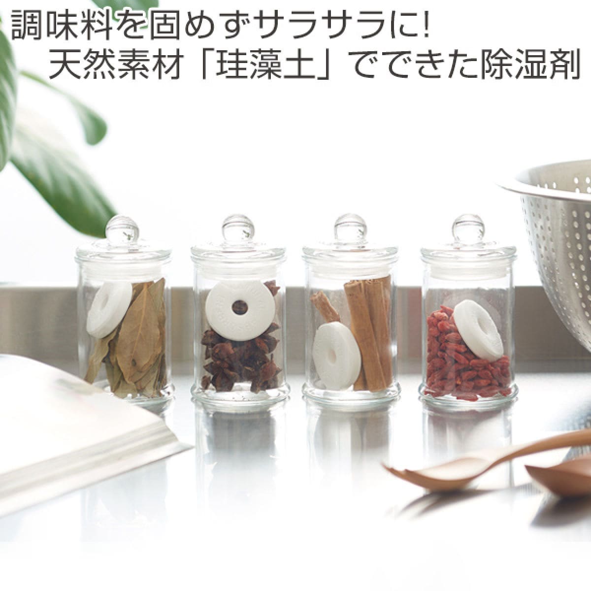 塩や顆粒コンソメなど、使っているうちに湿気で固まってしまいがちな調味料と一緒に入れておくだけ!吸湿性の高い「珪藻土」が湿気を吸い込み、さらさらの状態をキープします。