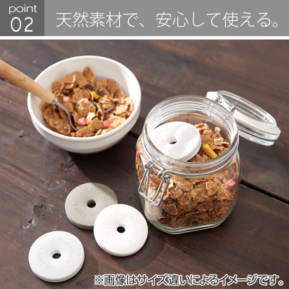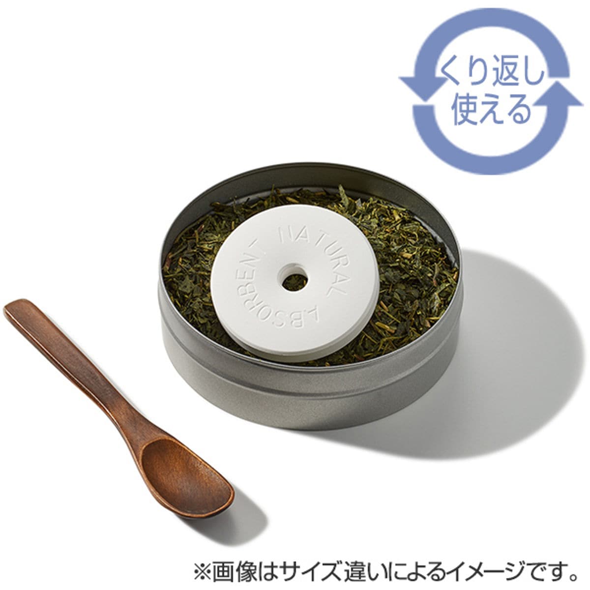 | くり返し使える 吸湿効果が薄れたら、天日干しかレンジで乾燥させてくり返し使えます。 | オシャレなデザイン 刻印の入ったドーナツ型のデザインで容器から見えてもオシャレです。 |