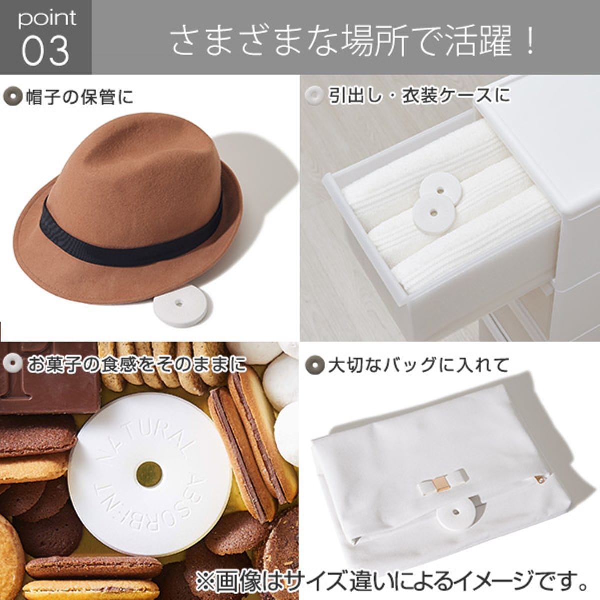 調味料や茶葉、シリアル、おかしなどキッチン周りはもちろん、クローゼットの引き出しや帽子の中など様々な場所で活躍します。