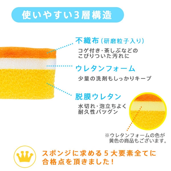 ●汚れ落ち、泡立ち、水切れ、耐久性、握りやすさ、すべての点で主婦モニターに最高点をもらったスポンジです。