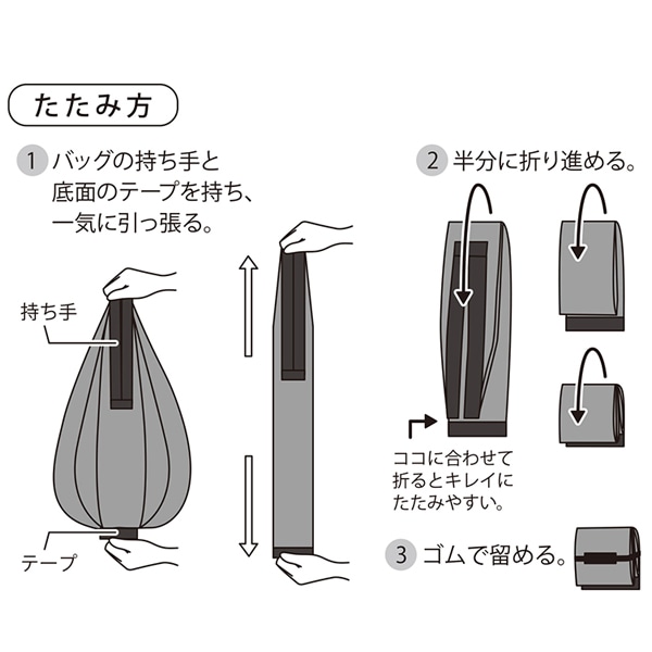 しまうのが面倒なエコバッグも、このシュパットなら両端を引っ張って伸ばし、あとは折り畳むだけで簡単に小さくまとめることが出来ます。