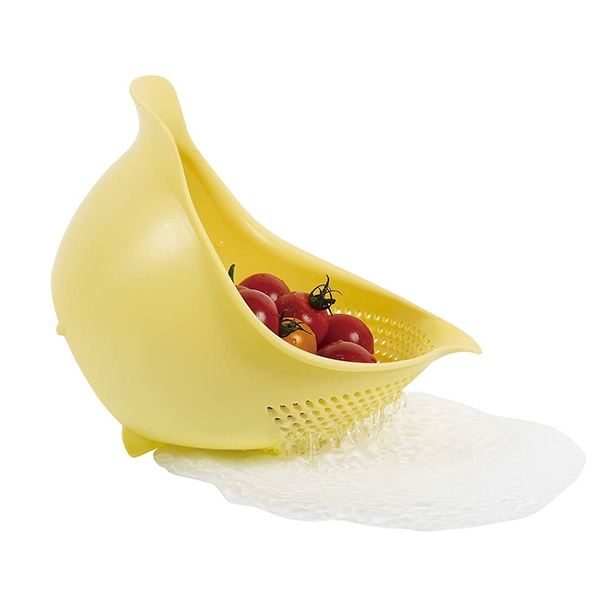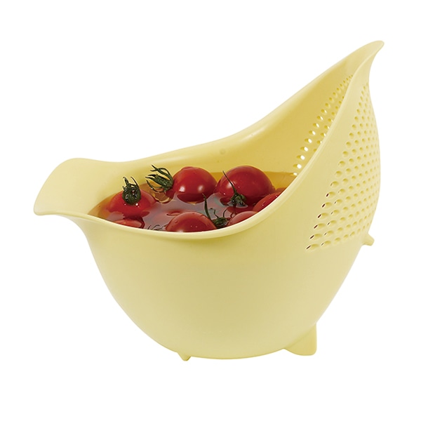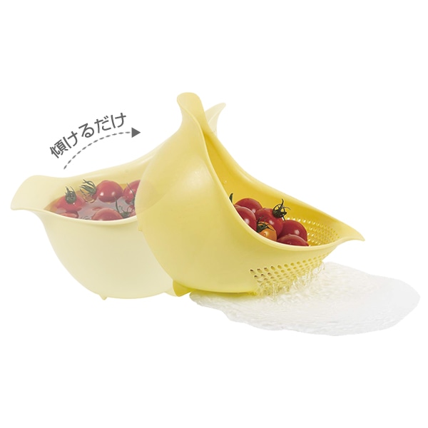 傾けるだけでザルとしても使える便利な水切りボウルです。これ1つでザルにもボウルにもなるので、洗い物を減らせて調理がスムーズに。傾けた状態で自立するので、手放しで水切りできるのも嬉しいポイントです。