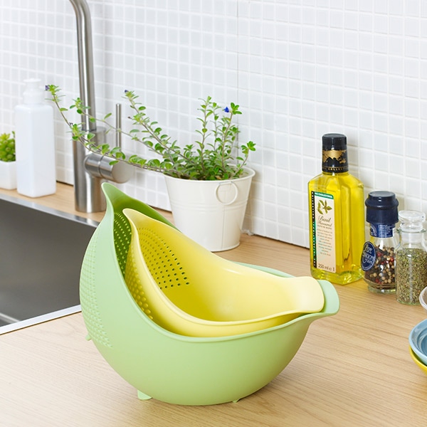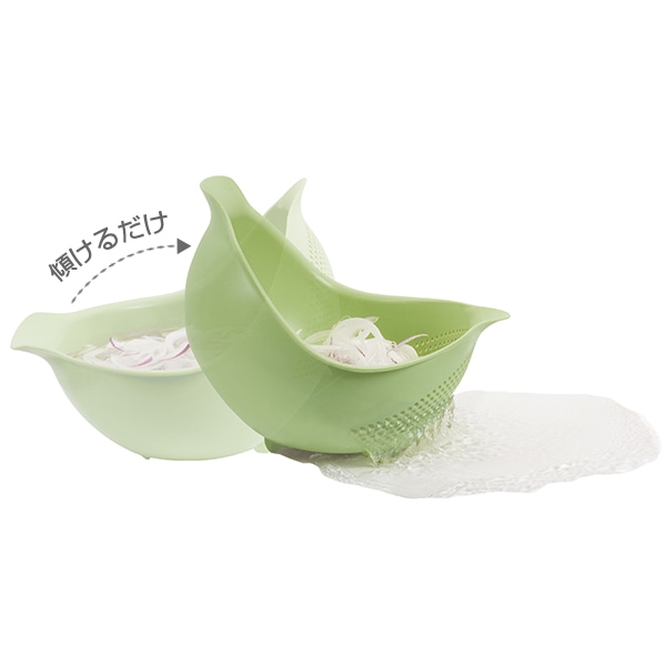 傾けるだけでザルとしても使える便利な水切りボウルです。これ1つでザルにもボウルにもなるので、洗い物を減らせて調理がスムーズに。傾けた状態で自立するので、手放しで水切りできるのも嬉しいポイントです。