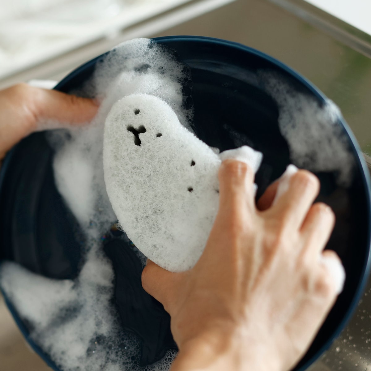 かわいらしいアザラシの形は、通常のスポンジよりも細長いので、コップなど深さのあるものも洗いやすいです。