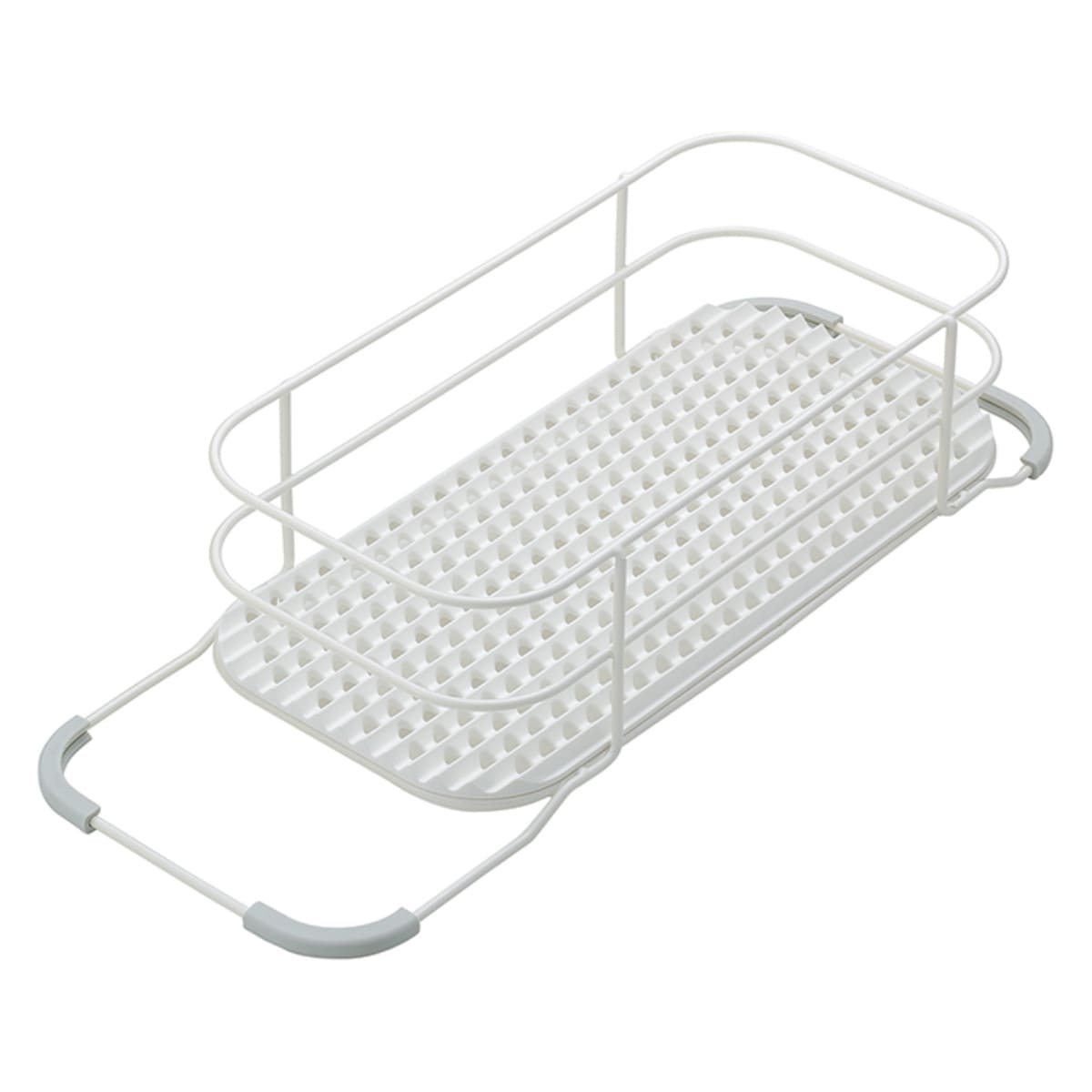 限られたスペースをキッチンワークの流れに合わせて使い分けができる水切りラックです。調理の時は作業台にしてスペースを拡大したり、片付けの時はシンクの中を使って水切りができます。