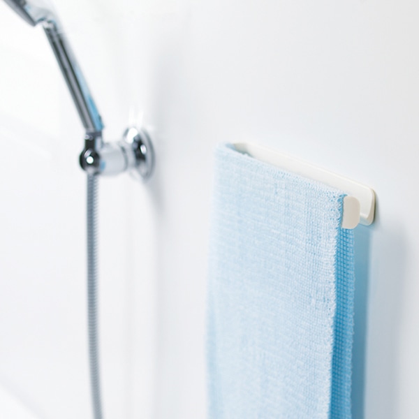 浴室の収納は他のお部屋と違って、かなり制限がありますよね。そんな時に活用したいのは『壁』です。最近の浴室の壁は鋼板が入っている事が多く、磁石が付く仕様になっているので『壁』を有効活用できます。こちらのタオルバーの裏面には磁石が付いており、浴室の壁面にぴたっと付けるだけで収納スペースが完成します!