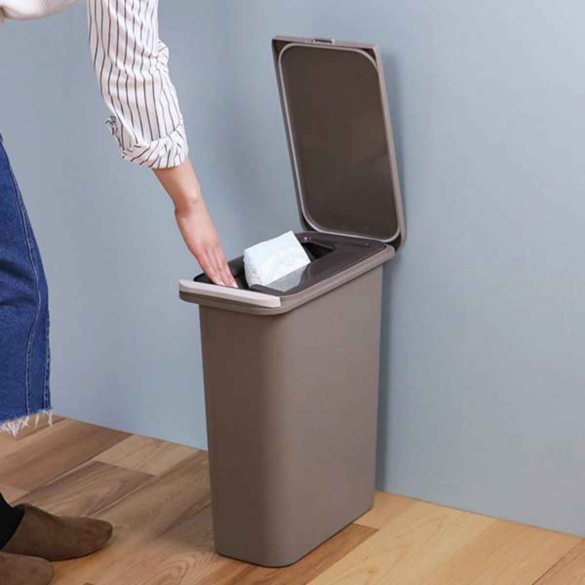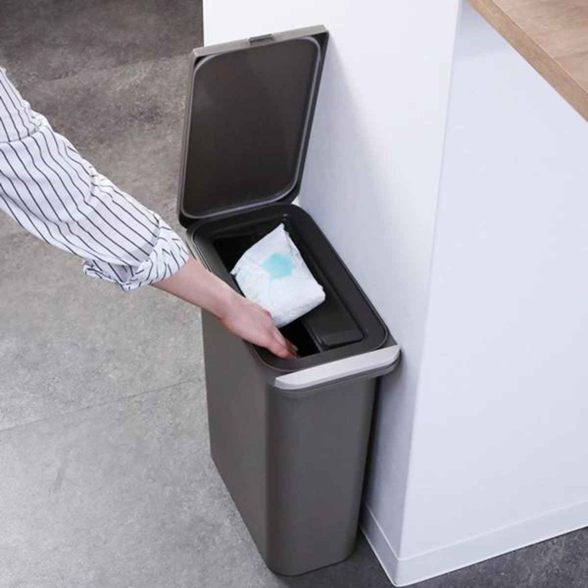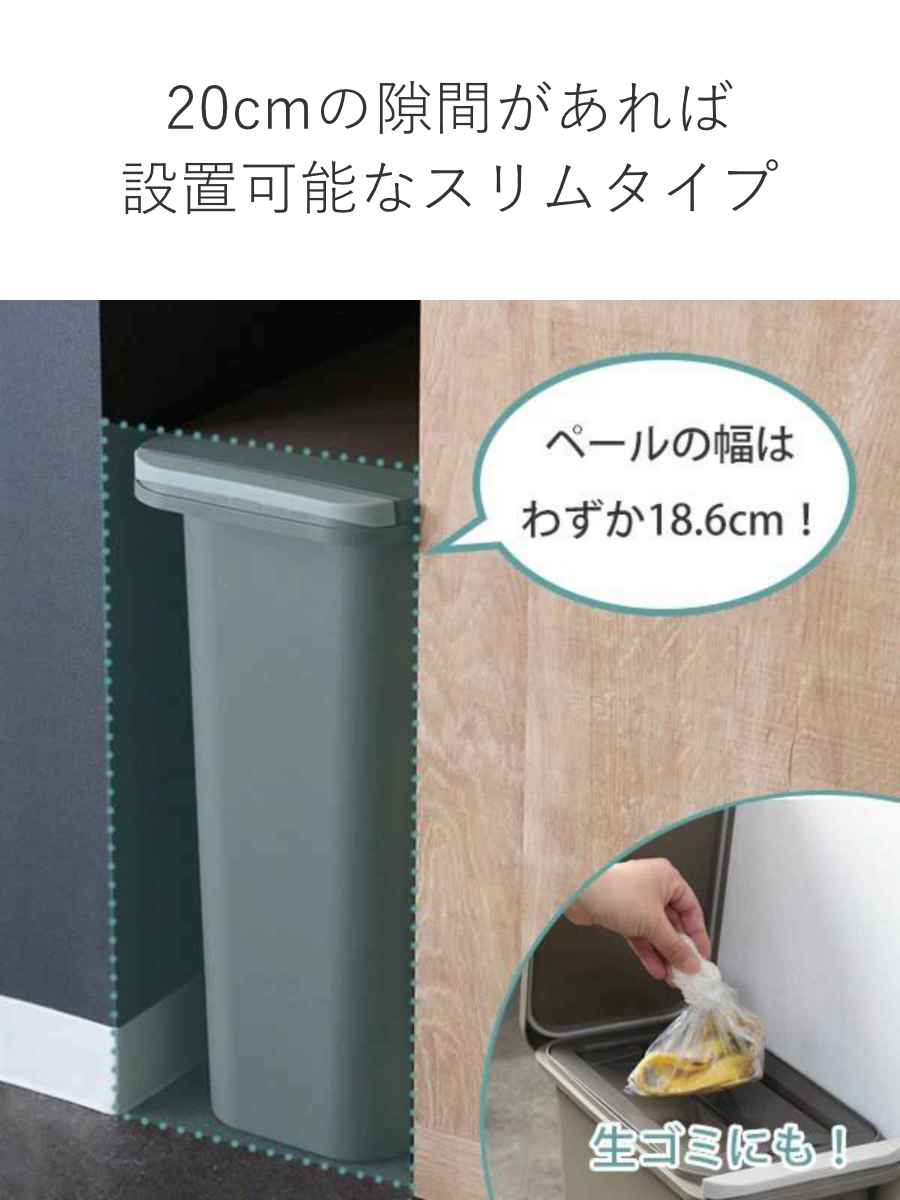 わずか20cmほどのすき間に置けるので、場所を選ばず便利です。トイレに置いてオムツ入れに、キッチンに置いて生ゴミの一時保管として、様々な用途でお使いいただけます。