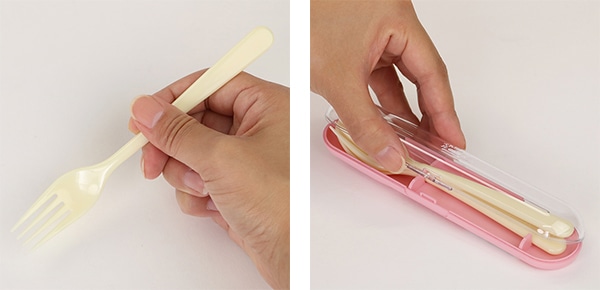 フォーク、スプーンを重ねてケースにコンパクトに収納できます。