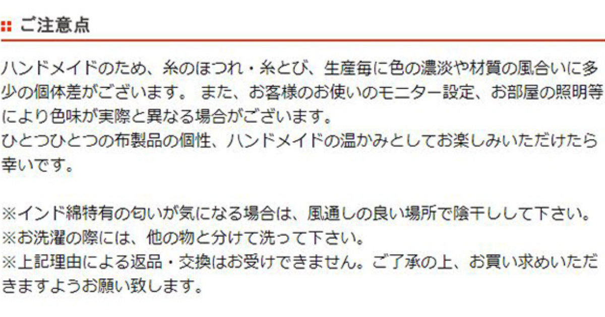 | 備考 | ※ハンドメイドのため、糸のほつれ・糸とび、生産毎に色の濃淡や材質の風合いに多少の個体差がございます ※インド綿特有の匂いが気になる場合は、風通しの良い場所で陰干ししてください。 ※お客様のお使いのモニター設定、お部屋の照明等により色味が実際と異なる場合があります |