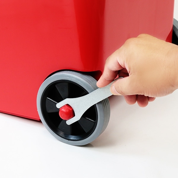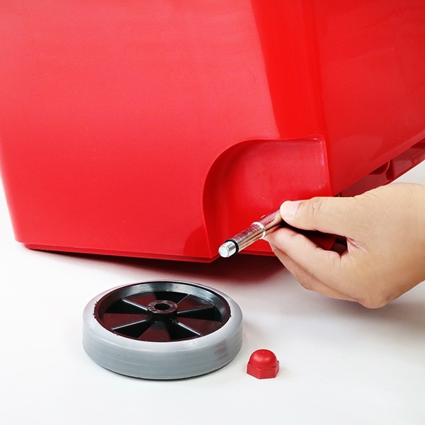 蓋の設置は左右2箇所にピンを取り付けるだけでOKです。キャスターは、付属のナットとボルトを使用して頂くだけで簡単に取り付けできます。