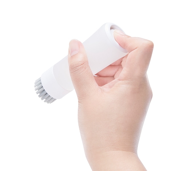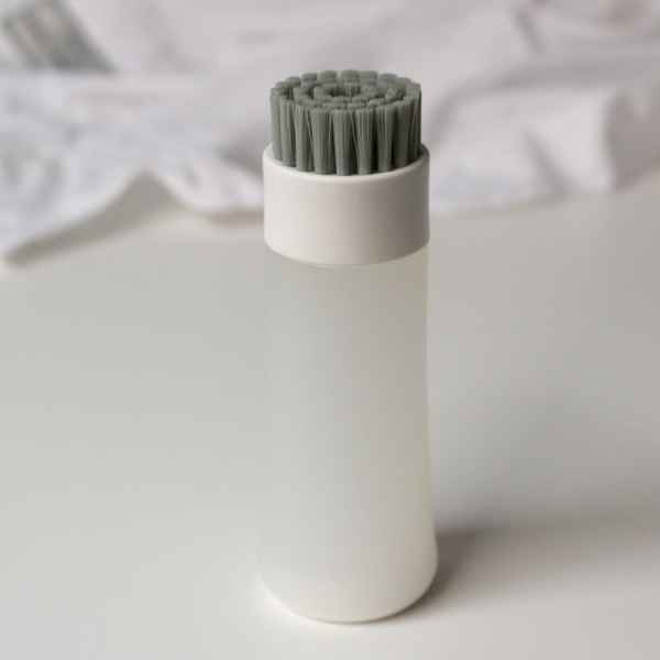 中に洗剤を入れて、底のボタンを押せば適量の洗剤が出て、えり・そで・シミ汚れを狙って洗いやすい。片手で扱いやすいコンパクトな形状もポイントが高いです。