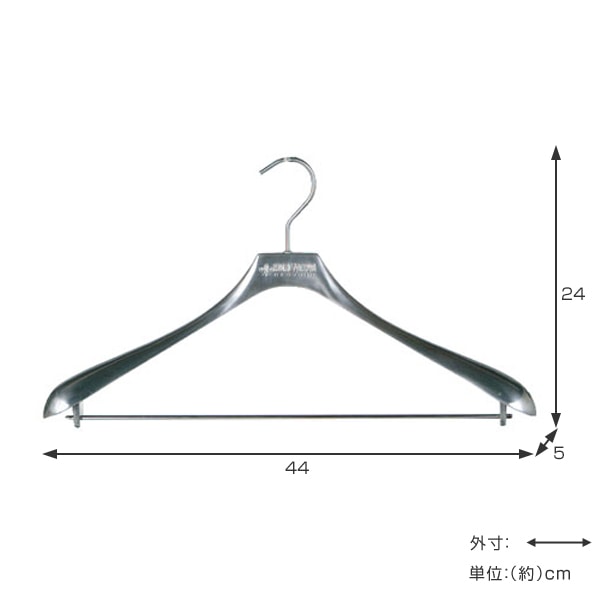 バー付きハンガーにバーが付いているので、スラックスやスカート、ネクタイなどを掛けておくことができます。上下の洋服を一緒に掛けておけば着替えるときに便利です。 | しっかりとした厚み肩先の厚みが5cmもあるので、型崩れを防ぎ、しっかりと洋服のラインを守ってくれます。 |