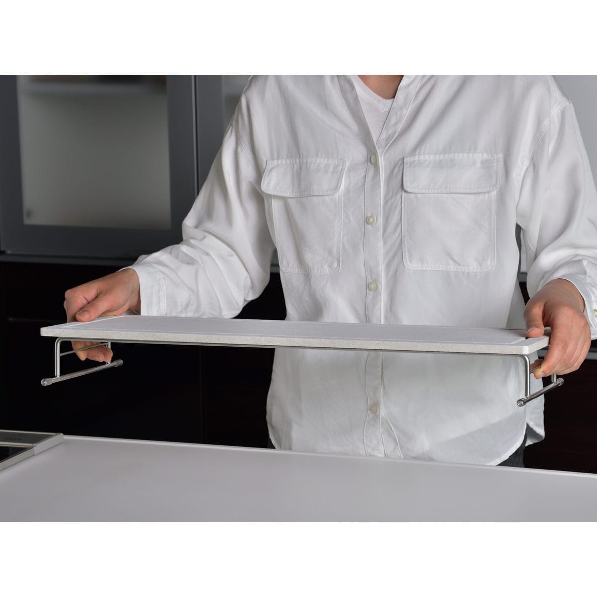 付属のスタンドは丁度いい高さでデザインされており、ボード下を収納スペースとして活用できます。お気に入りのお皿を収納して置けば、できたお料理をすぐに盛り付けできます。もちろん、お掃除にも丁度いい高さだから上に物をのせたままサッと拭けるので、ラックをどかす必要が無く、小さな手間やストレスも無駄な時間と一緒にカットしちゃえます。かといって移動させにくいわけじゃない。スタンドの中心の丁度いい場所に持ち運びがしやすいようにワイヤーを渡してあるので、設置や移動、模様替えなんかもラクラクです。スタンド四隅には滑り止め兼置いた場所を傷めないようにクッションゴムを設置。隅から隅まで便利な一品に仕上げました。