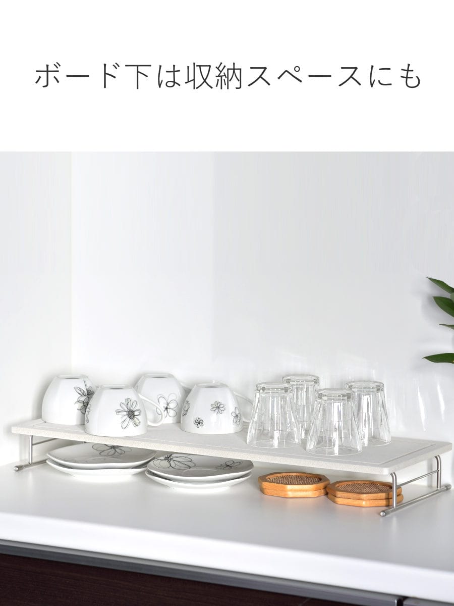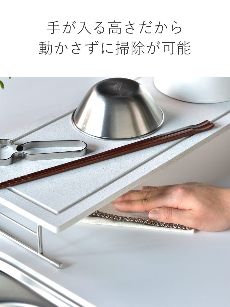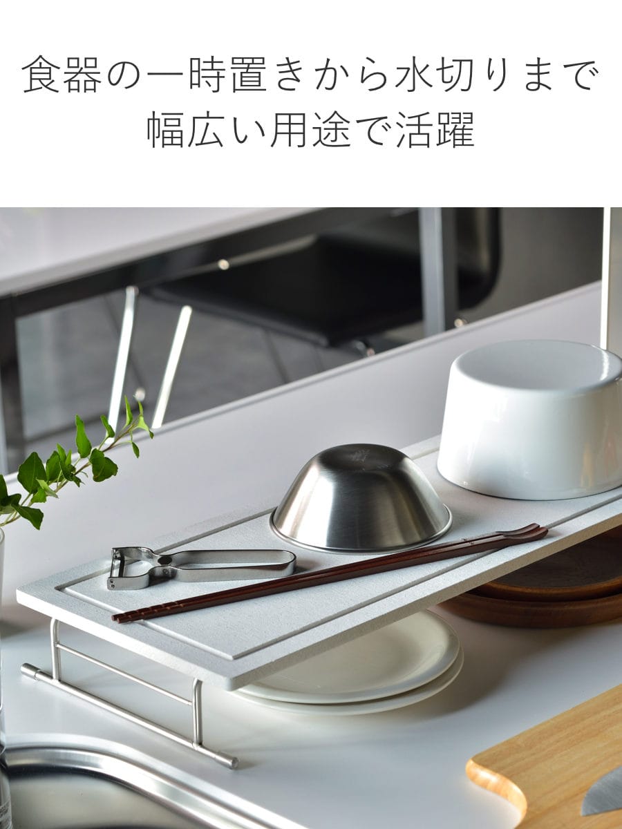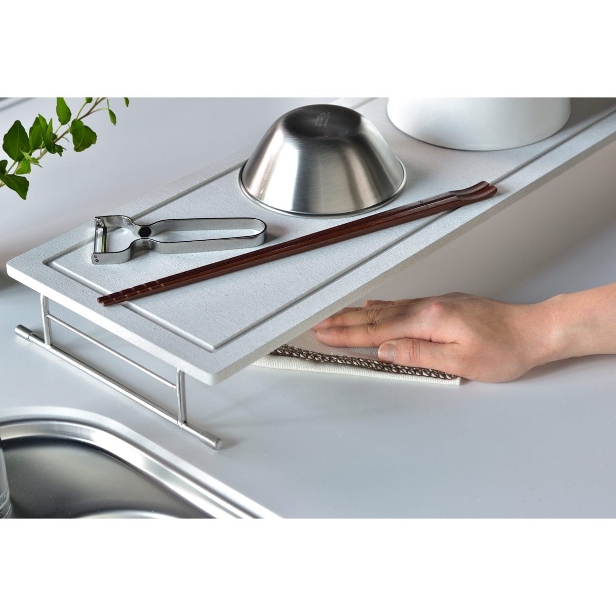 そのまま水切りトレーとして使える吸水ボードに、頑固なステンレスのスタンドをセット。トレーが水分を吸い取るので、水気のついたものをそのまま置いても大丈夫。洗ったばかりのコップやお茶碗、お鍋なども、拭かずにそのまま乗せられる、時短家事の強い味方です。木製や金属製、プラスチックのボードとは違い、ぬめりや水垢の心配もいりません。さらに防カビ、消臭効果も兼ね備えた、水回りの収納に最適です。