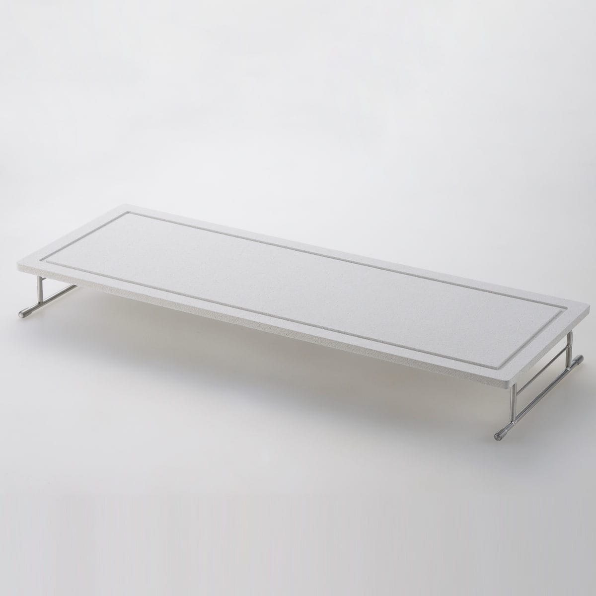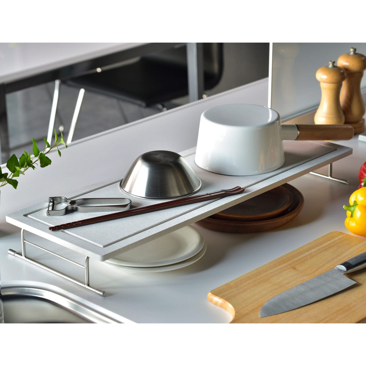 スタイリッシュなワイヤーフレームの本体と、落ち着いたオフホワイトのボードが特徴的なキッチンラックです。本体は防サビ、耐久性共に優れたステンレスを金物職人の街、燕三条で加工して製造しています。ボードは乗せたものから落ちた水滴を吸水し、自然に乾燥する「モイス」を使用しているので、キッチンのちょい置きスペースとしてはもちろん、水切りトレーとしても活躍します。