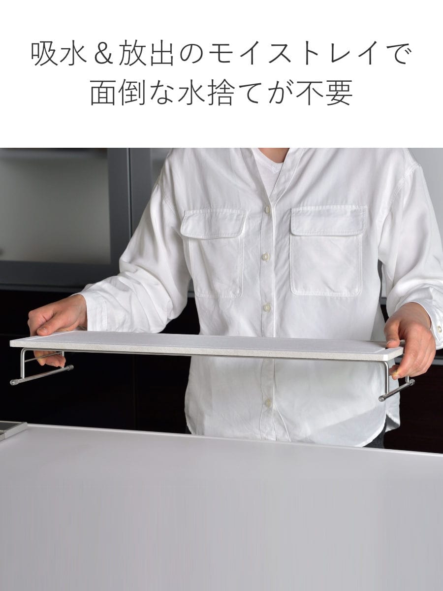 吸水トレーとして使用されているモイスは、天然鉱物であるバーミキュライト、珪藻土などを使った日本製の吸湿素材です。まるで呼吸するかのように洗い物から落ちた水滴を吸収し、自然な形で空気中に放湿します。水捨ての手間も、水垢の心配もいらない、時短家事の強い味方です。