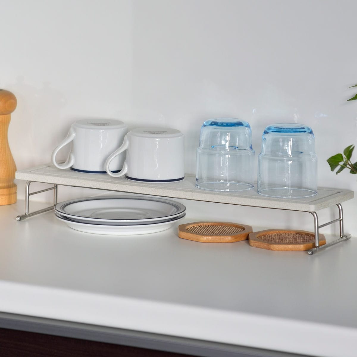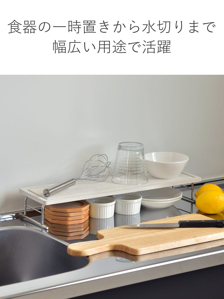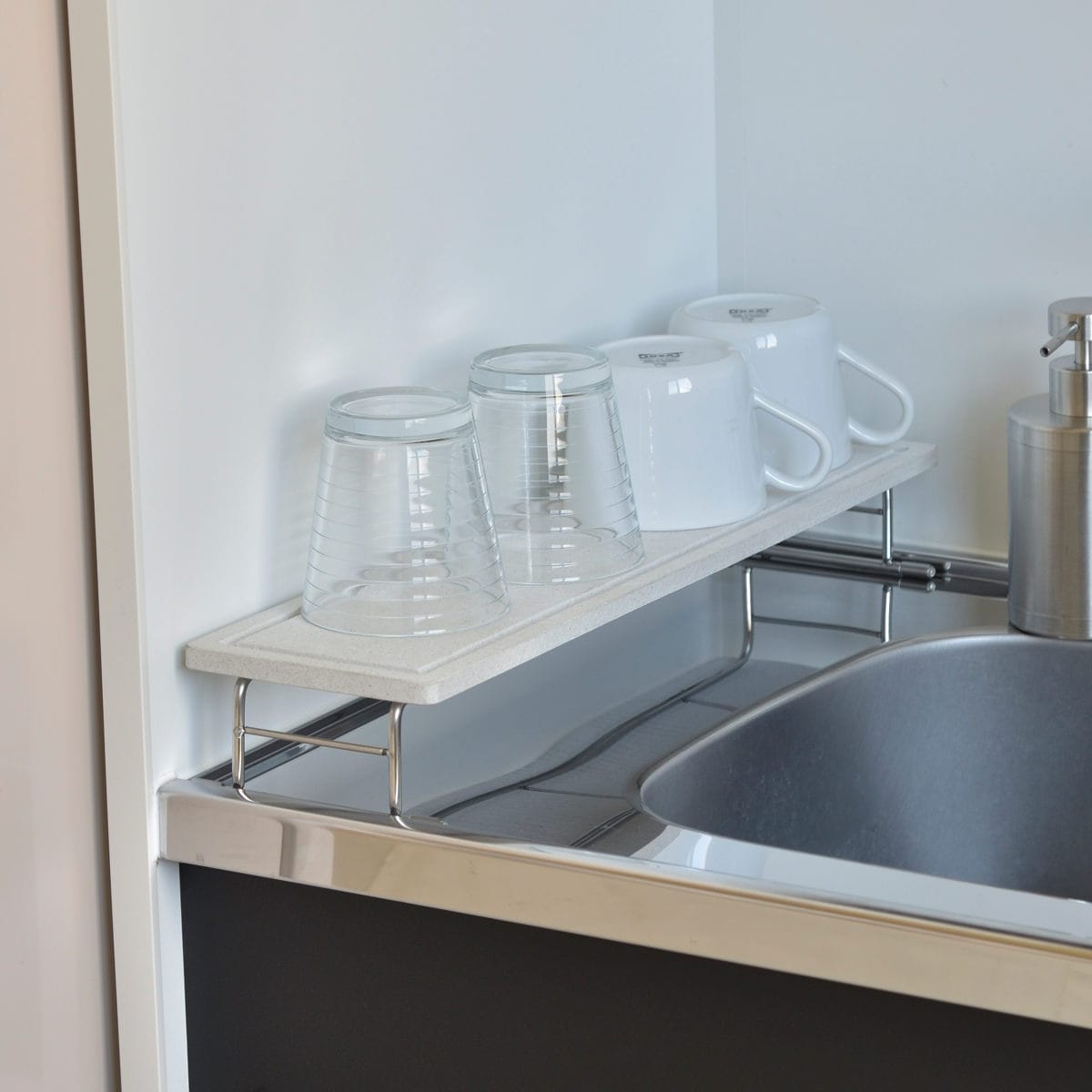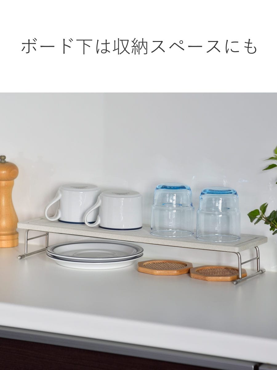 そのまま水切りトレーとして使える吸水ボードに、頑固なステンレスのスタンドをセット。トレーが水分を吸い取るので、水気のついたものをそのまま置いても大丈夫。洗ったばかりのコップやお茶碗、お鍋なども、拭かずにそのまま乗せられる、時短家事の強い味方です。木製や金属製、プラスチックのボードとは違い、ぬめりや水垢の心配もいりません。さらに防カビ、消臭効果も兼ね備えた、水回りの収納に最適です。