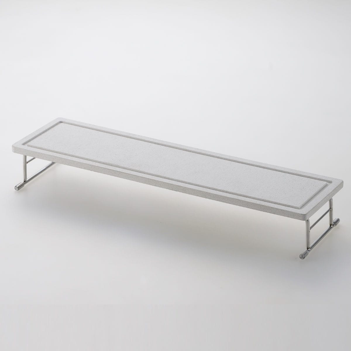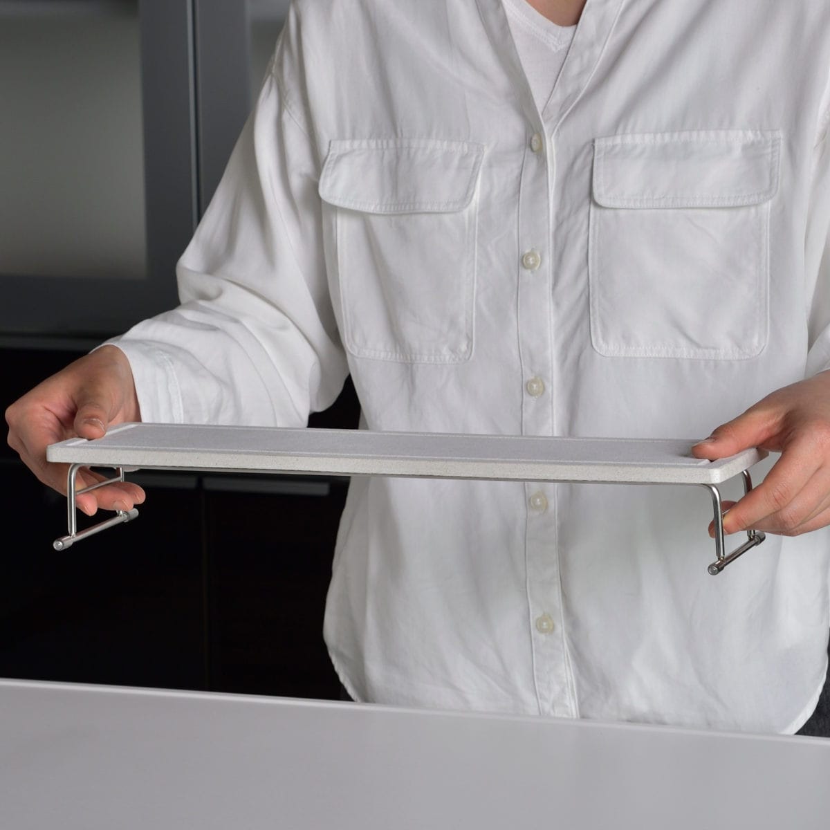 スタイリッシュなワイヤーフレームの本体と、落ち着いたオフホワイトのボードが特徴的なキッチンラックです。本体は防サビ、耐久性共に優れたステンレスを金物職人の街、燕三条で加工して製造しています。ボードは乗せたものから落ちた水滴を吸水し、自然に乾燥する「モイス」を使用しているので、キッチンのちょい置きスペースとしてはもちろん、水切りトレーとしても活躍します。