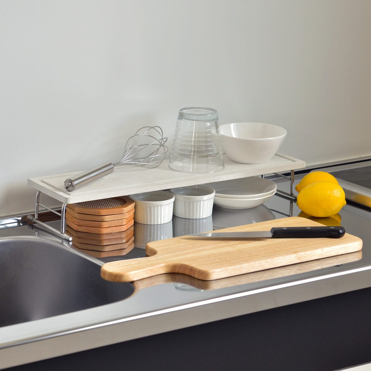 シンクの横等、活用しづらいスペースでも設置できるよう設計されたロングボディ。スペースが無くてもシンクの上に渡して設置できるので、今まで使えていなかったデッドスペースを活用できるかも。もちろん収納力もバッチリ!片手鍋やボウル、菜箸やピーラー等の調理器具、洗ったお皿やこれから使うお茶碗まで、みんなまとめて大丈夫。