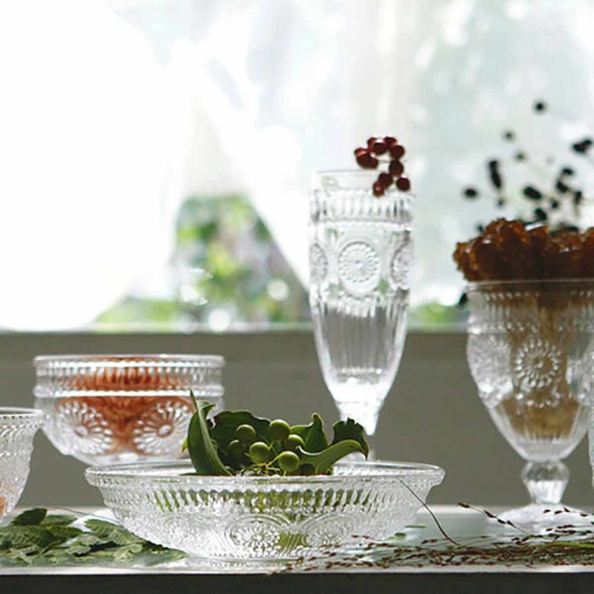 マーガレットがモチーフの、どこか懐かしくもフレッシュなガラス食器です。ただそこにあるだけで目を引くデザインは、花瓶や小物入れとしてもお使いいただけます。