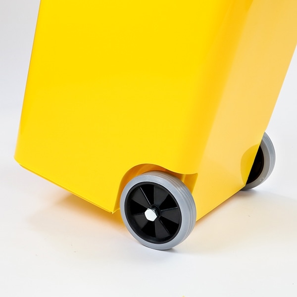 簡単に移動ができる便利なキャスター付きです。また、フタは本体に付いているのでゴミ袋の取り出しも楽々です。