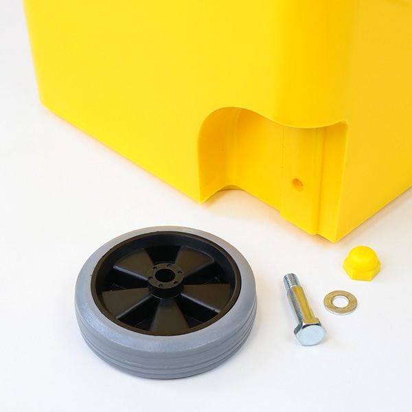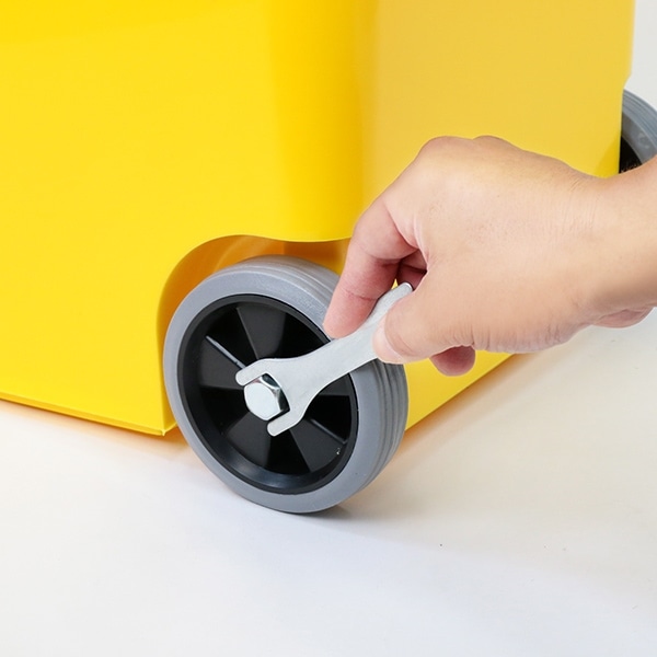 蓋の設置は左右2箇所にピンを取り付けるだけでOKです。キャスターは、付属のナットとボルトを使用して頂くだけで簡単に取り付けできます。