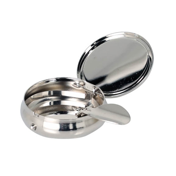 | コンパクトサイズ 直径5cmと掌にのる小さなサイズで服のポケットに入れて持ち運べます。 | 煙草ホルダー内蔵 全面シルバーで仕上がっている灰皿内は、煙草ホルダーが内蔵されています。 |
