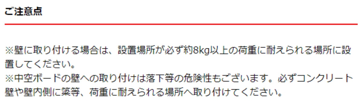 ※壁に取り付ける場合は、設置場所が必ず約8kg以上の荷重に耐えられる場所に設置してください。