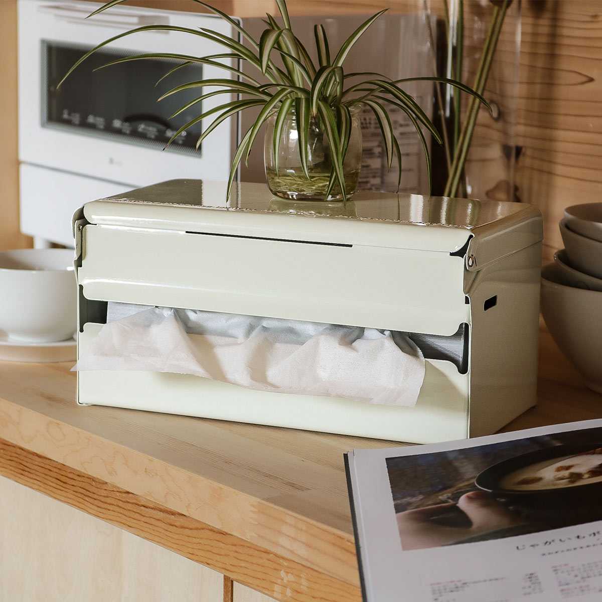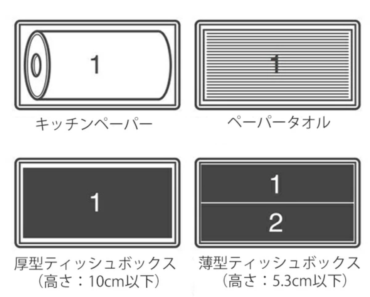 幅24×奥行11×高さ10cm以下のロールタイプのキッチンペーパー、ペーパータオル、厚型のティッシュボックス、薄型のティッシュボックスが収納できます。箱型ティッシュボックスは箱ごとセットが可能です。さらに薄型のティッシュボックスは2箱セットできるので、1箱なくなってしまってももう1箱がスタンバイしているので便利です。