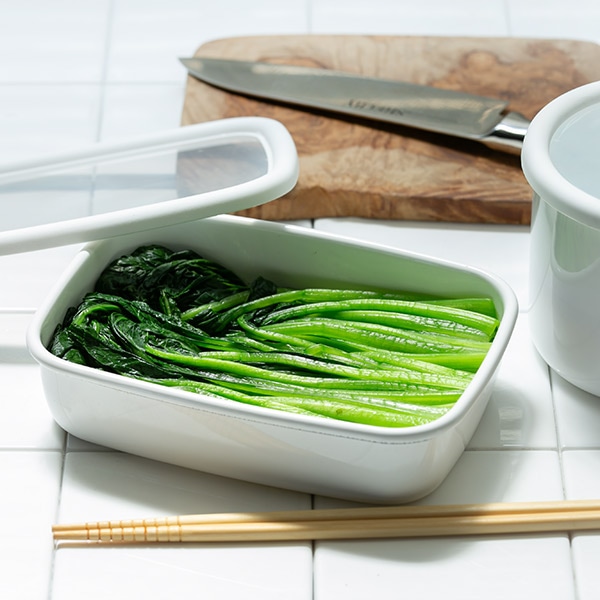 表面がガラス質のホーロー製品は、色やにおい、酸に強く様々な食品の保存に適しています。どんな料理もすっきり美しく演出してくれる、オールホワイトのカラーで常備菜作りや作り置きも楽しくなります。