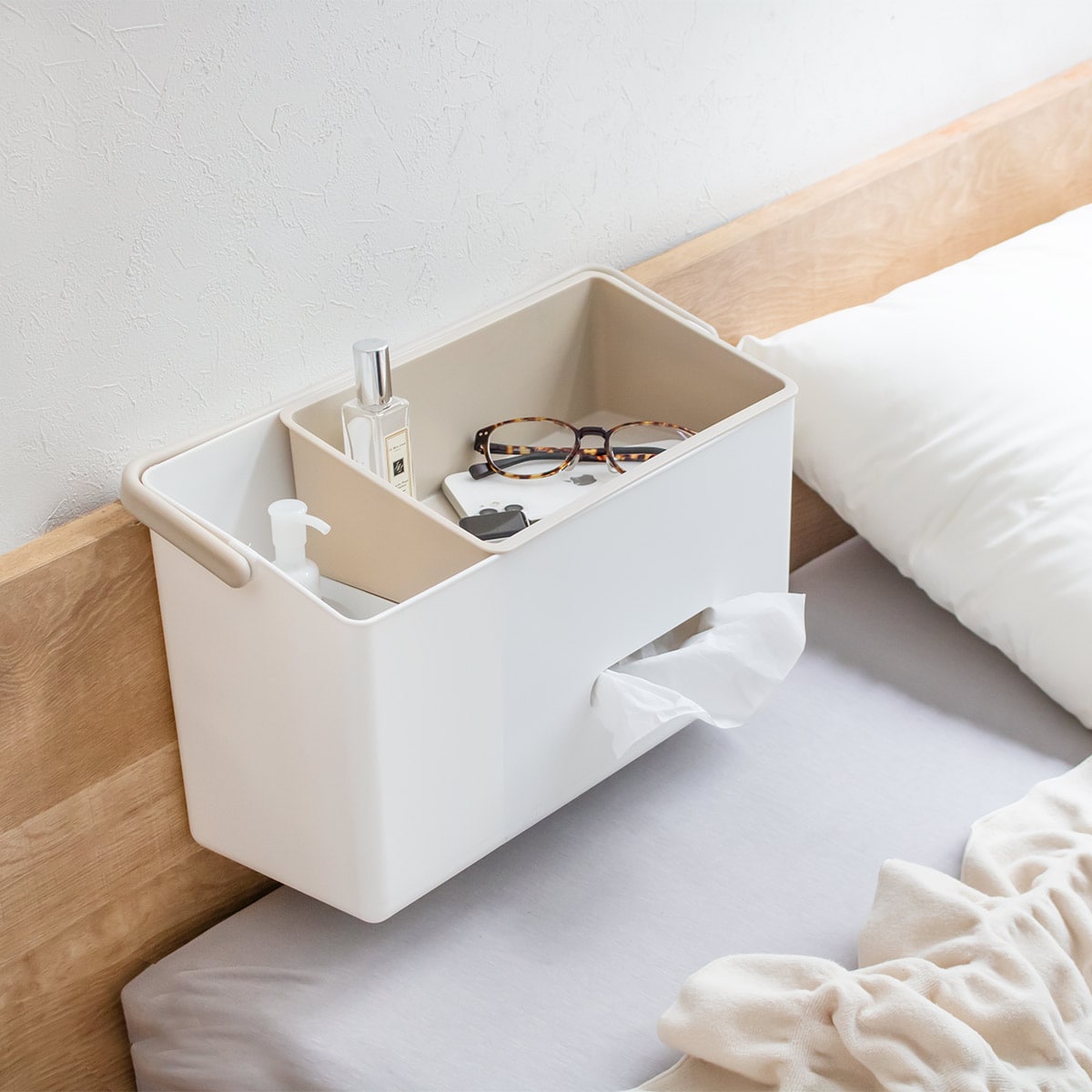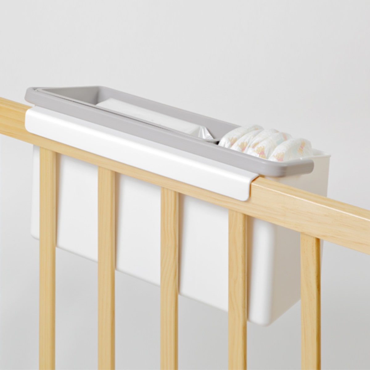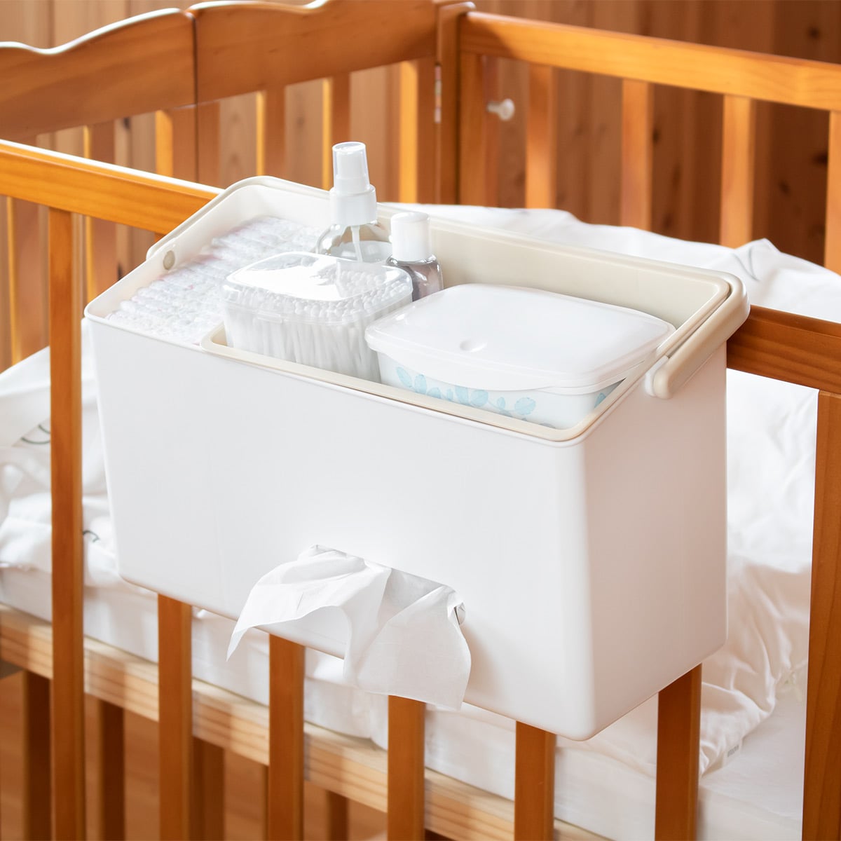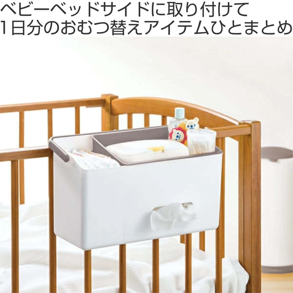 ベビーベッドなどの柵に掛けてお使いいただけます。おむつやおしり拭き、冷却シート、ベビーパウダーや体温計などの赤ちゃんのケア用品をまとめて、すぐに手の届く範囲に置いておけます。