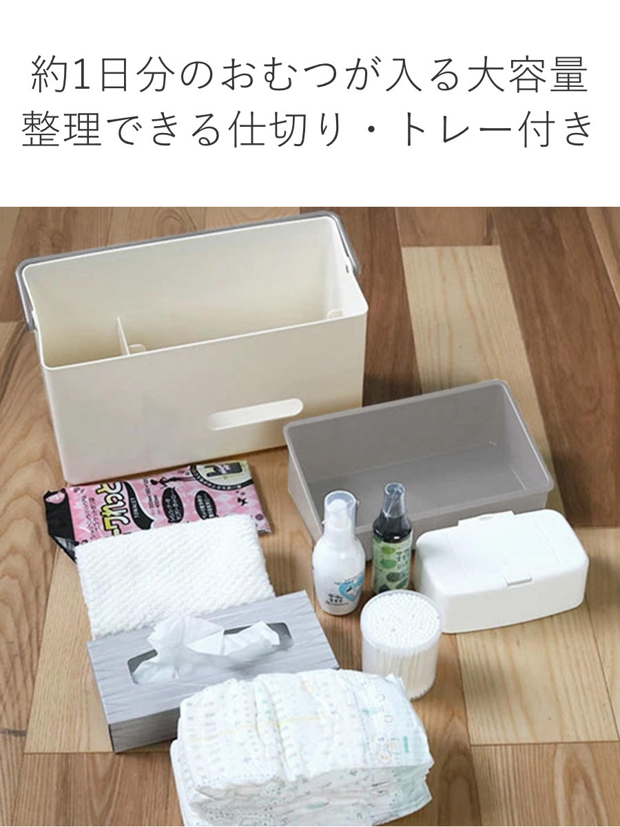 おむつ約10枚、ティッシュ、タオル、ビニール袋、ベビーローション、ウェットティッシュ、綿棒など。仕切りやトレーがついており、細かなものもしっかり整理整頓しておけます。