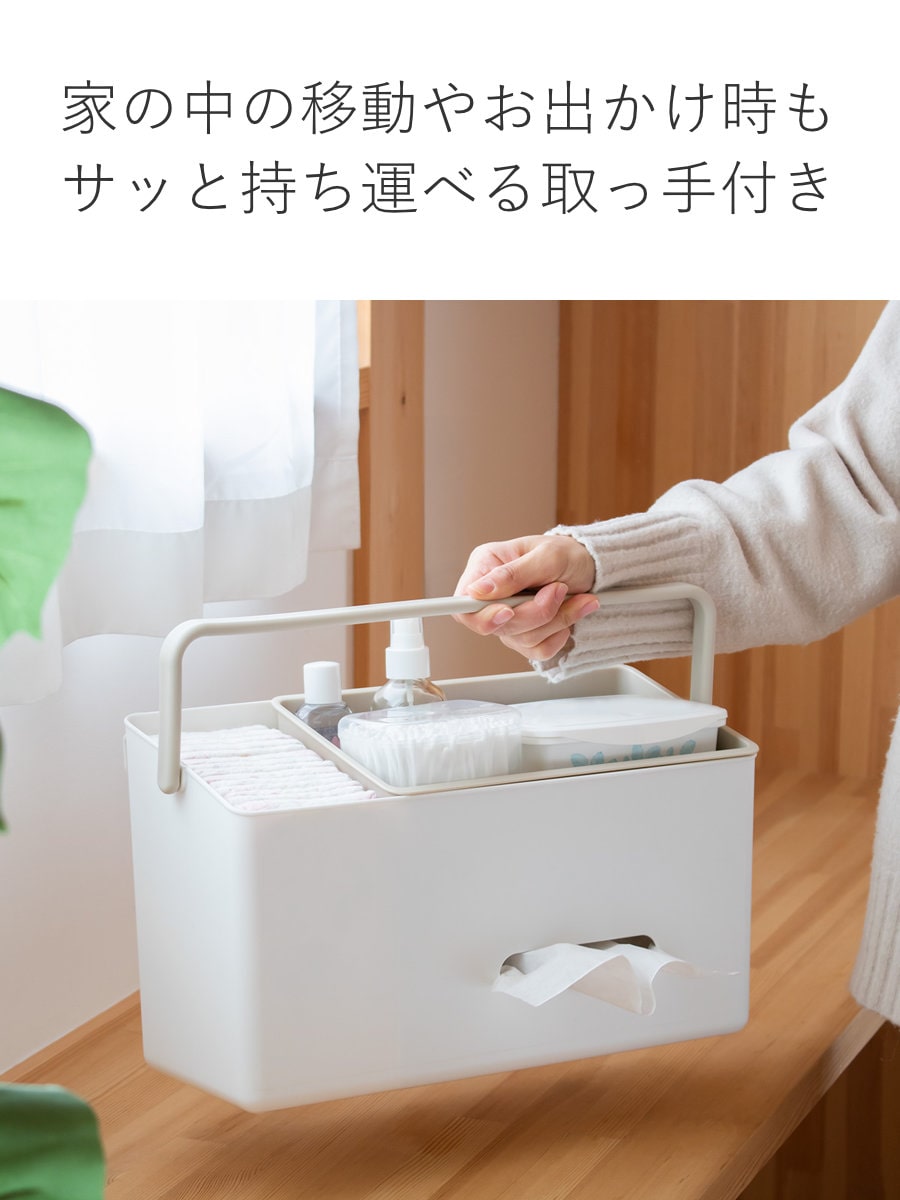 フタ付きではないので、トレーよりも高いものも収納できます。良く使う綿棒などのお世話グッズを入れておくと便利です。
