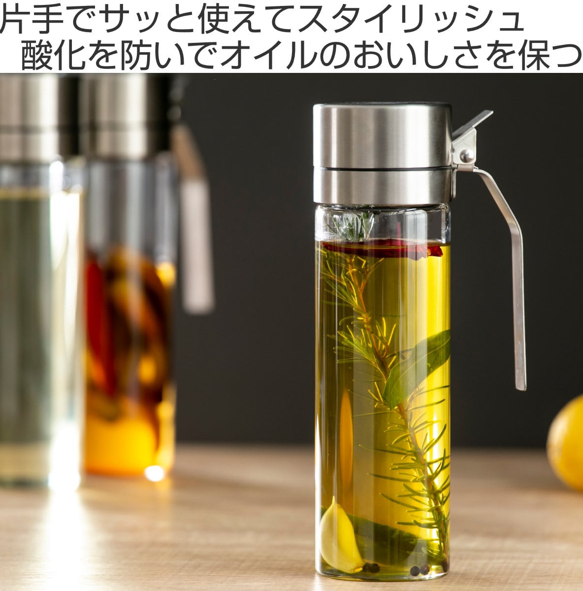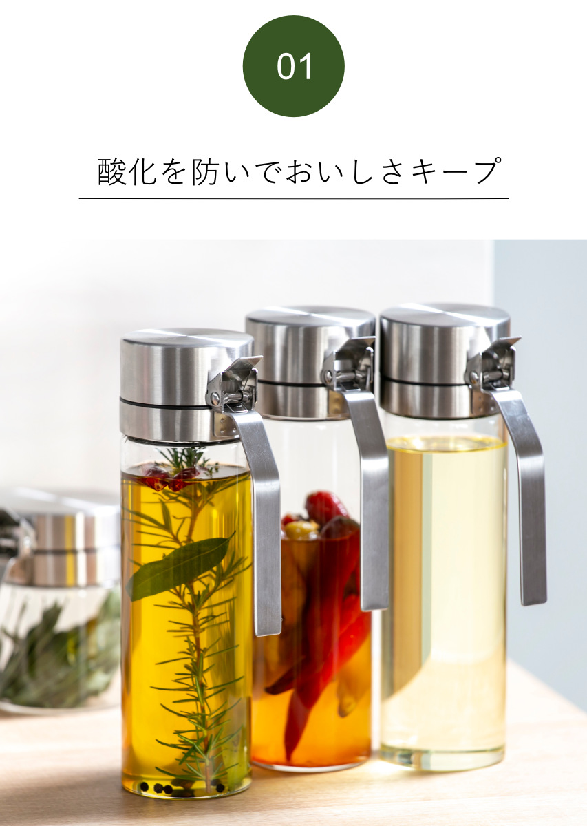 オイルの大敵である酸化を防いでくれる、ガラス製オイルボトルです。使い勝手抜群のスタイリッシュなデザインは、キッチンのみならず食卓でもデイリーに活躍。オイルの鮮度を保ち、毎日のおいしい食事をアシストします。