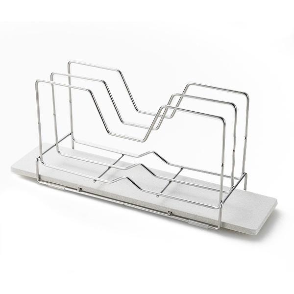 スタイリッシュなワイヤーフレームの本体と、付属の吸水トレーが特徴的なまな板スタンドです。本体は防サビ、耐久性共に優れたステンレスを金物職人の街、燕三条で加工して製造しています。特徴的な吸水トレーにはまな板から落ちた水滴を吸水し、自然に乾燥する「モイス」を使用しています。