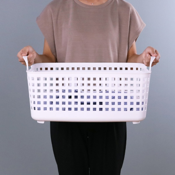 洗濯物用としてはもちろん、収納用としても使いやすく、マルチに活躍するバスケットです。格子状で通気性の良いデザインなので、水回りの収納に最適、タオルや着替えを置いておくバスケットとしても便利です。