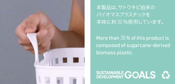 | 手にしっくり馴染む 両サイドに設けられた持ち手は、手にフィットしやすい形なので、重くても手が痛くなりにくく、しっくり馴染みます。 | 環境に優しい素材を使用 原材料には、バイオマスプラスチックを約30%使用しています。地球環境に優しく、安心してお使いいただけます。 |