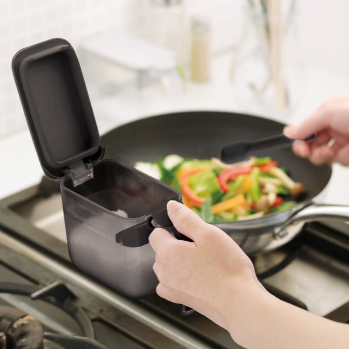 手元の操作でワンタッチでフタが開くので、調理しながら使いたいときにさっと取り出すことができます。調味料をすくいやすいようにフタは奥に開き、手元が見やすいデザインです。