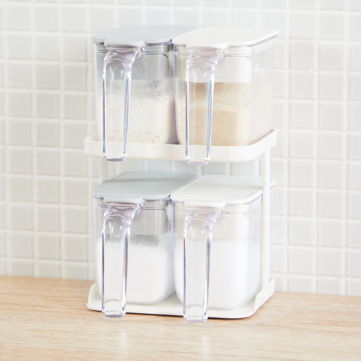 専用の調味料ラック(別売)を使用すれば、調味料ポットを1段に2個ぴったり収納することができます。1段に2個、最大で4個収納することができます。
