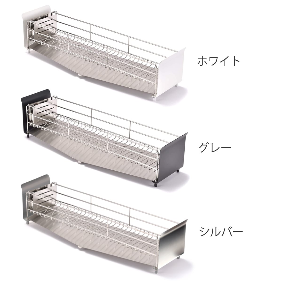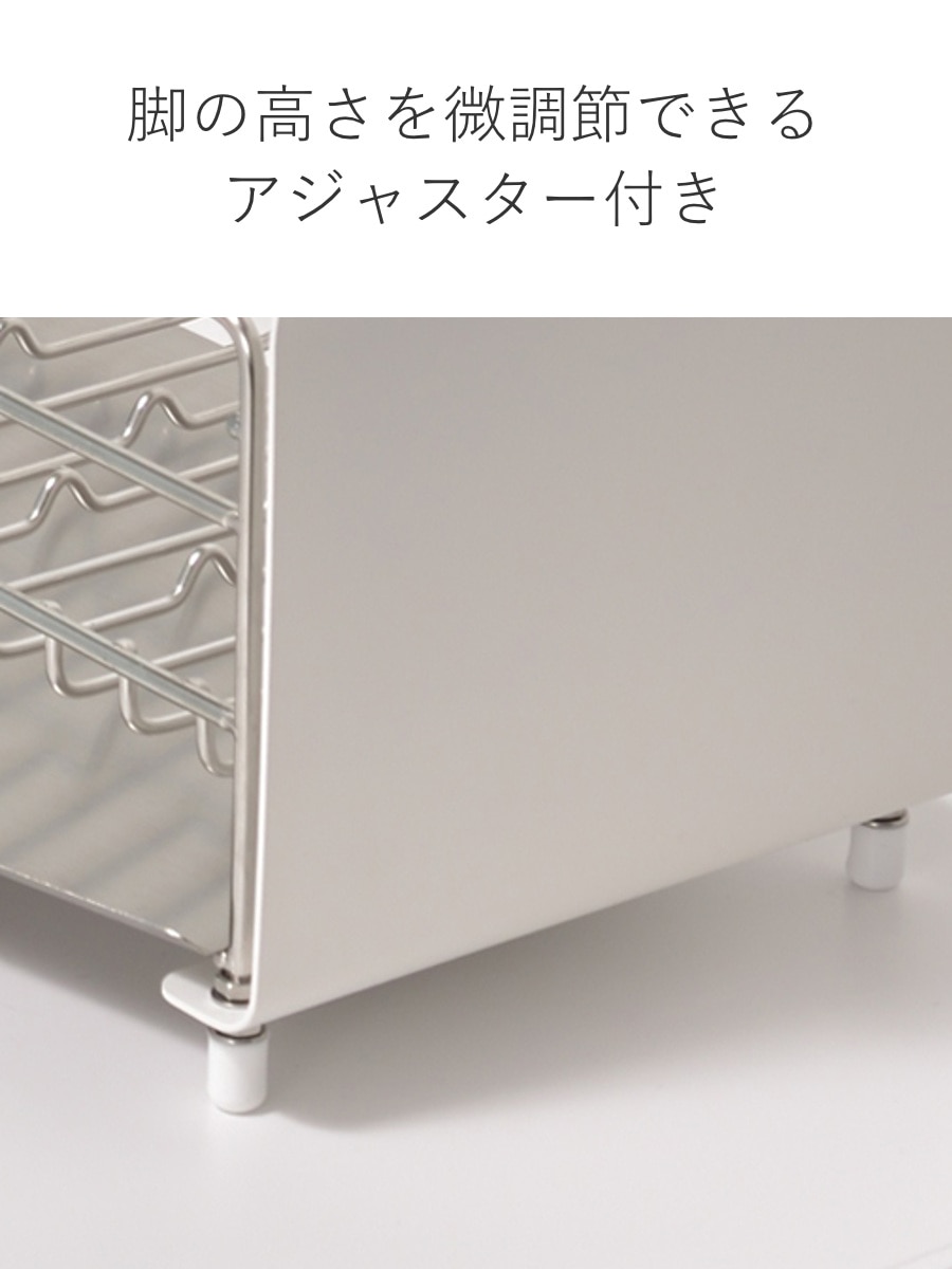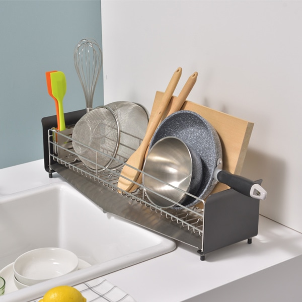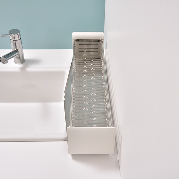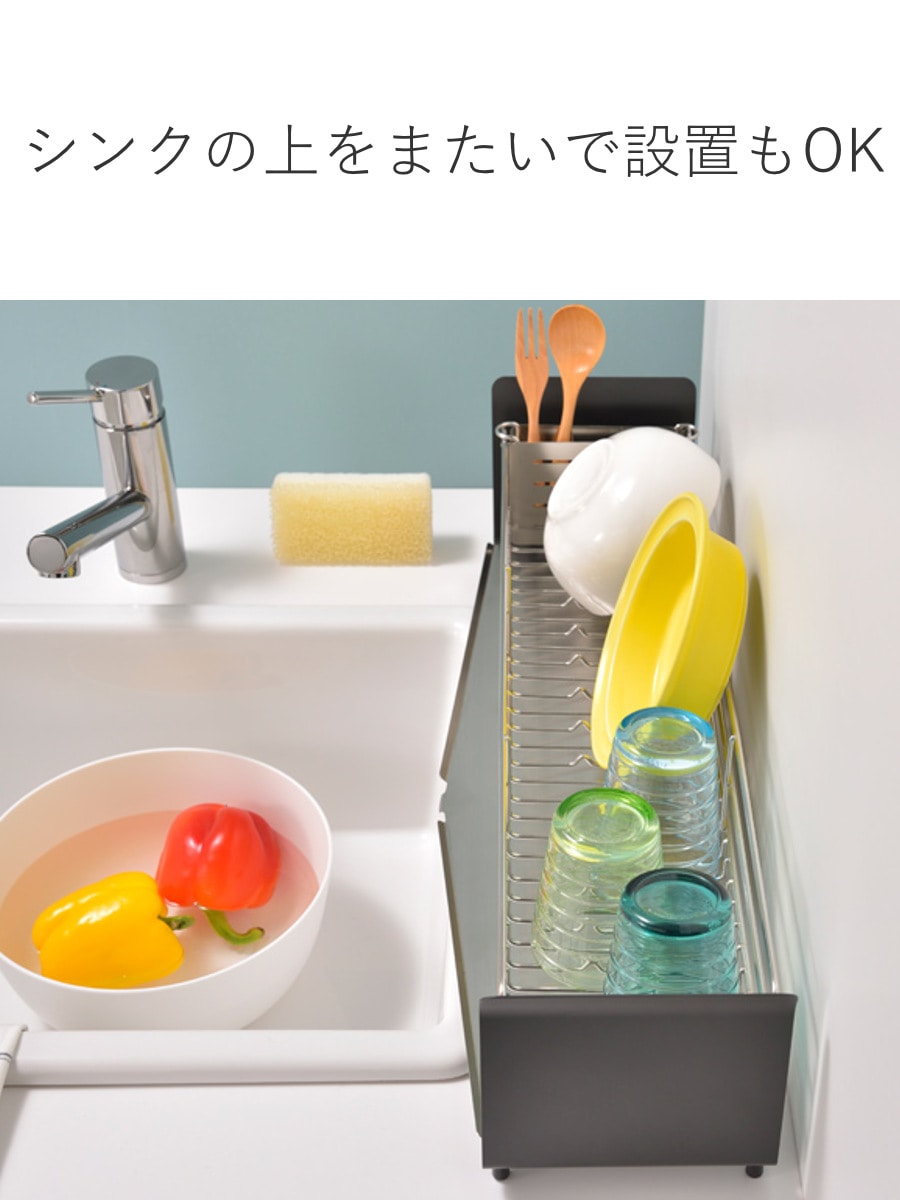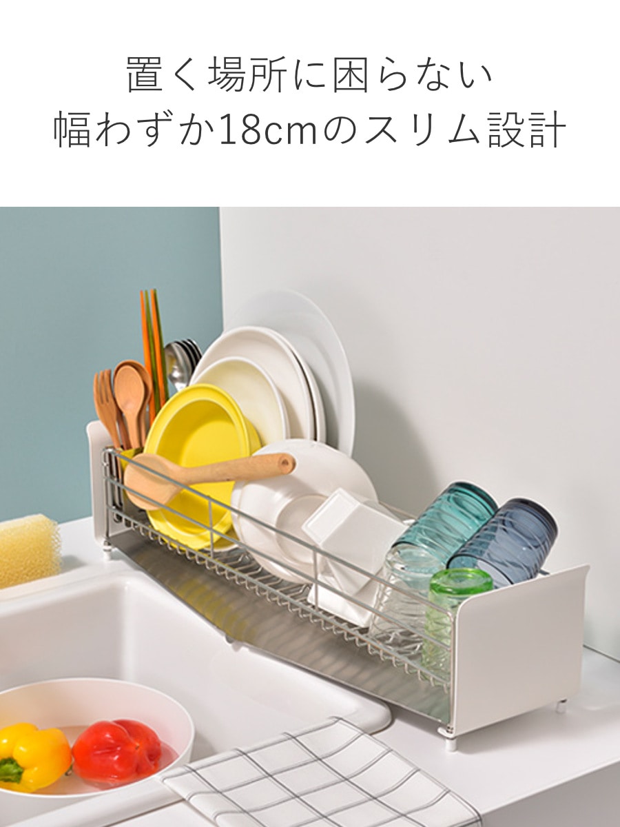 幅わずか18cmとスリムなので、シンク周りに置くスペースがない方でも設置しやすいサイズです。普段は食洗機使いで、水切りラックにスペースを取りたくない方にも食洗機のサブとしてお使いいただけます。スリムな見た目にもかかわらず大容量の収納力で、スッキリと収納してくれます。縦長サイズなので、シンクの上をまたいで設置もできます。