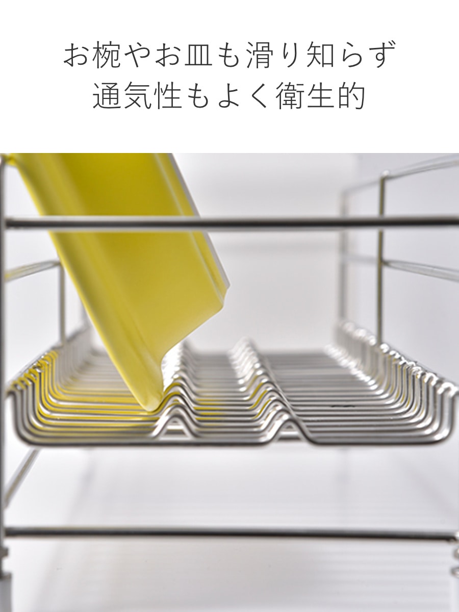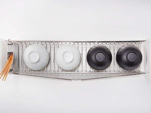 「 ハナウタ 」でお馴染みの縦にも横にもお皿が立つ「たてよこウェーブ」搭載の水切りラックです。底部のワイヤーに波状の突起を作ることで、お皿を縦にも横にも安定して置くことができます。お椀やお皿もすべり知らず、考えなくてもよいお皿洗いができ、思わず歌ってしまうくらい軽やかに。ストレスフリーな上に収納力・作業効率もアップします♪