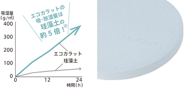 エコカラットは、LIXILが開発した多孔質セラミックスを使用しています。珪藻土の約5倍の吸・放湿量、同等以上の吸水スピードがあります。(※試験結果はLIXIL試験方法によるものです。環境条件によって結果は異なります。)