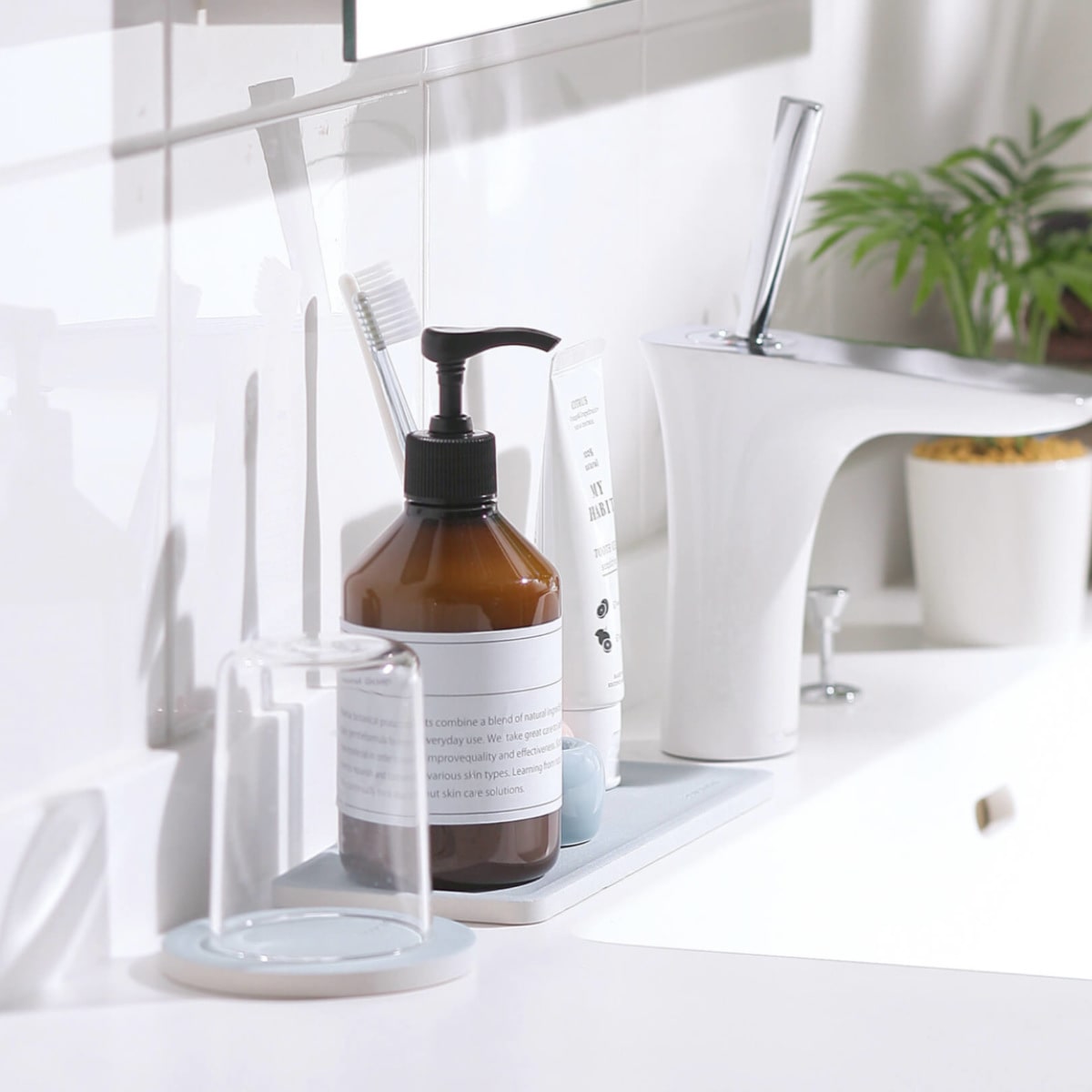 歯磨きコップ等の水滴をすばやく吸収する、多孔質セラミックス素材のコップスタンドです。優れた吸収力で水滴を素早く吸収し、カラッと快適な洗面台に。お手入れが楽にできて衛生面も安心です。(※同シリーズ洗面トレーを含むイメージ画像です。)