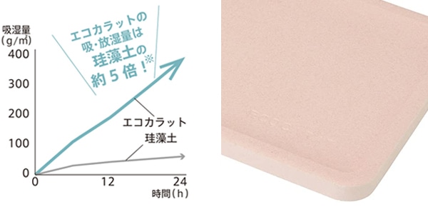 エコカラットは、LIXILが開発した多孔質セラミックスを使用しています。珪藻土の約5倍の吸・放湿量、同等以上の吸水スピードがあります。(※試験結果はLIXIL試験方法によるものです。環境条件によって結果は異なります。)